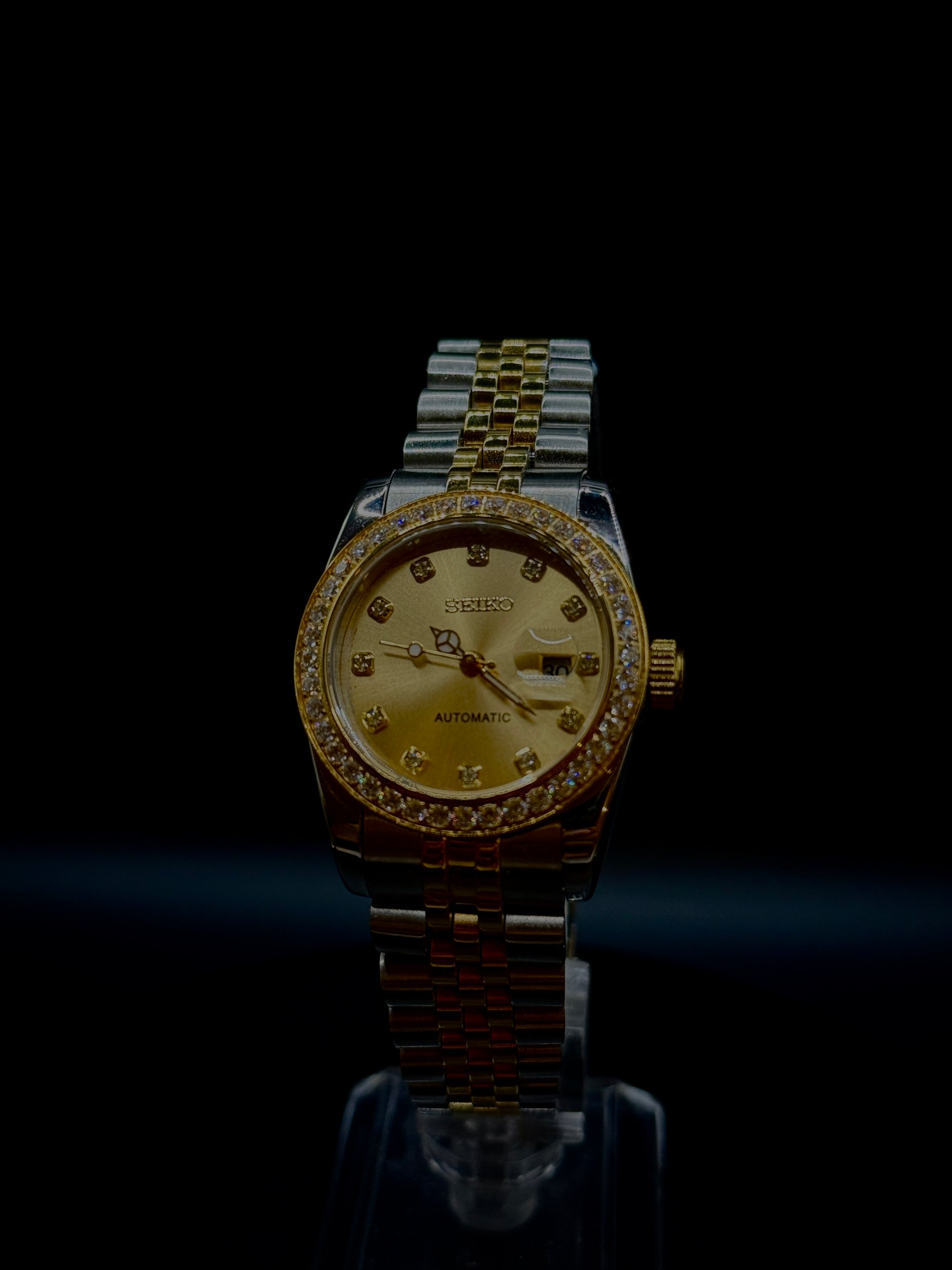 Featuring a warm gold sunburst dial set within an optional diamond-set bezel, this watch strikes the perfect balance between sophistication and everyday wear. The compact 30mm case offers a graceful fit on the wrist, making it ideal for both daily elegance and special occasions.
