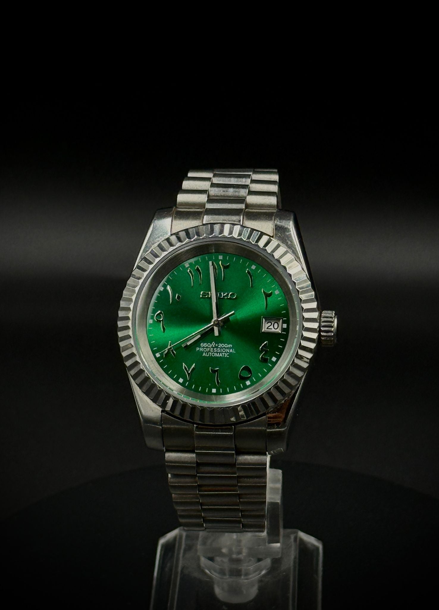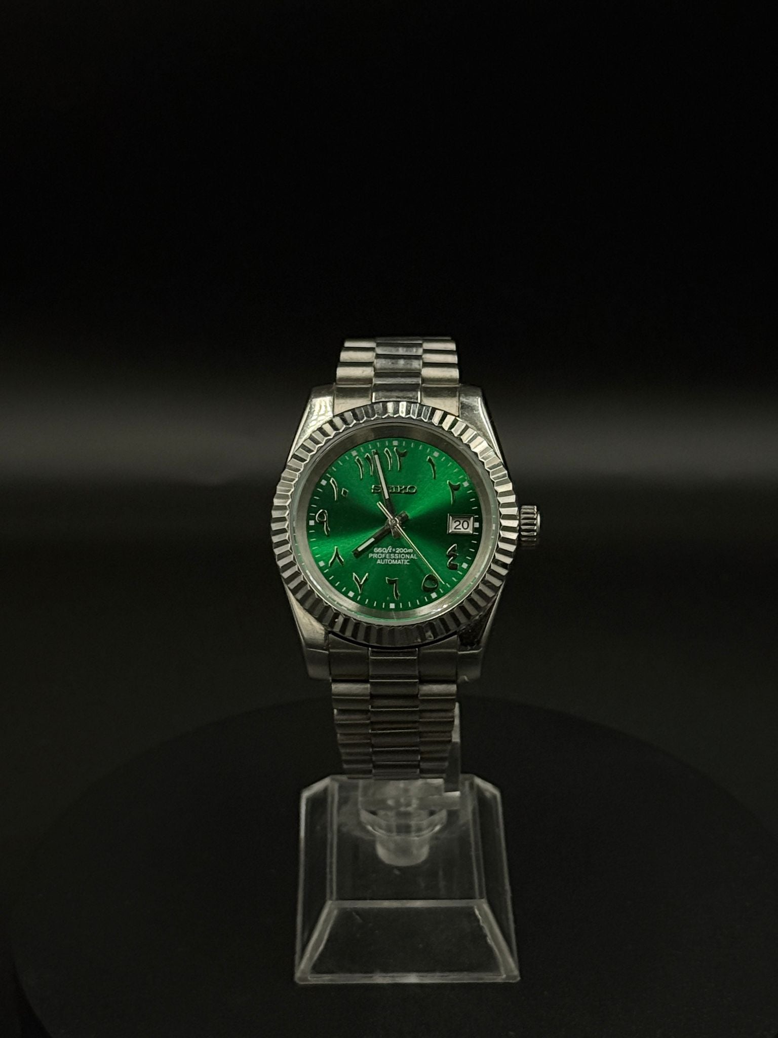 A bold, timeless design with cultural sophistication. This Seiko mod features a striking emerald-green sunburst dial with Eastern Arabic numerals, a fluted bezel, and a stainless steel Jubilee-style bracelet.