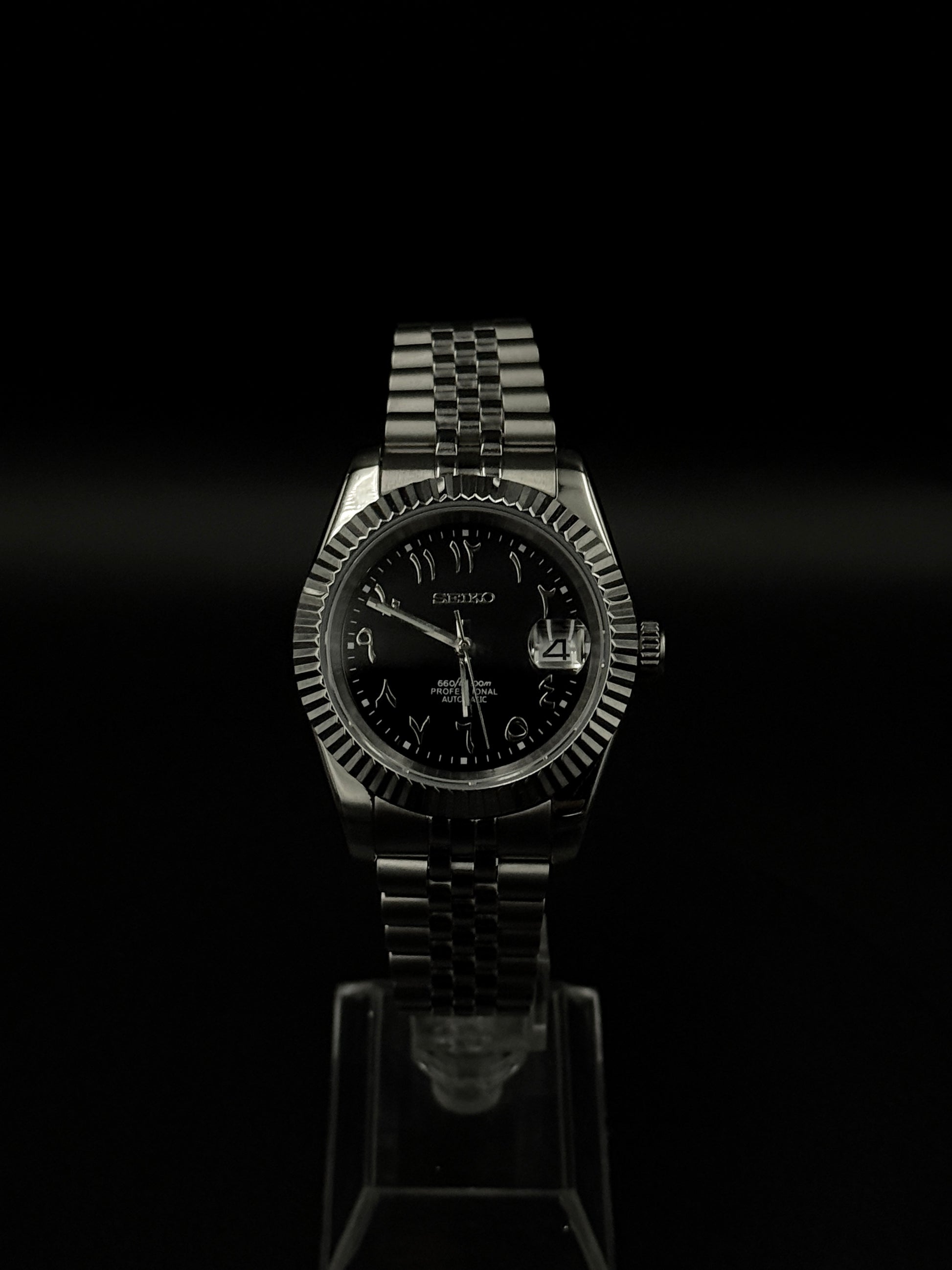 A clean, timeless design with cultural elegance. This Seiko mod features a deep black sunburst dial with Eastern Arabic numerals, a fluted bezel, and a stainless steel Jubilee-style bracelet.