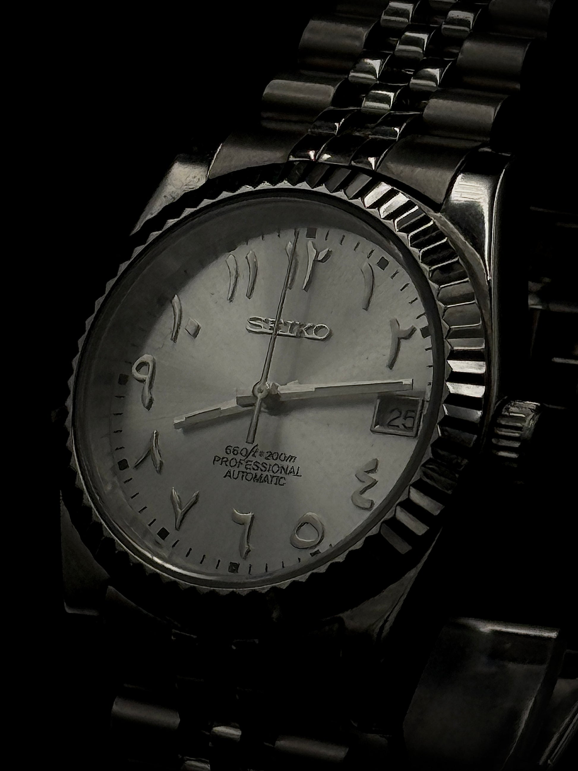 A bold, timeless design with cultural sophistication. This Seiko mod features a striking silver sunburst dial with Eastern Arabic numerals, a fluted bezel, and a stainless steel Jubilee-style bracelet.